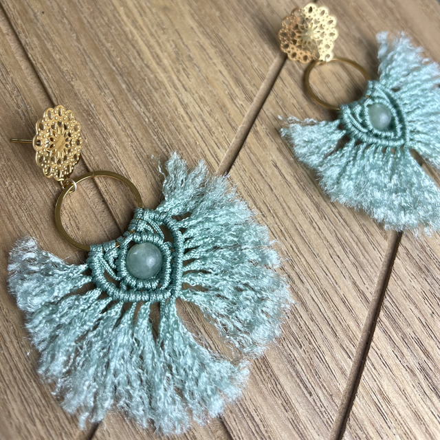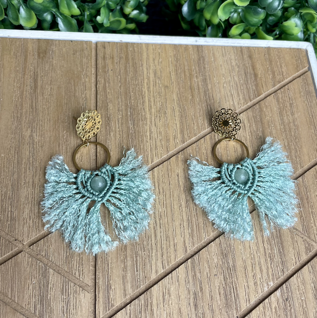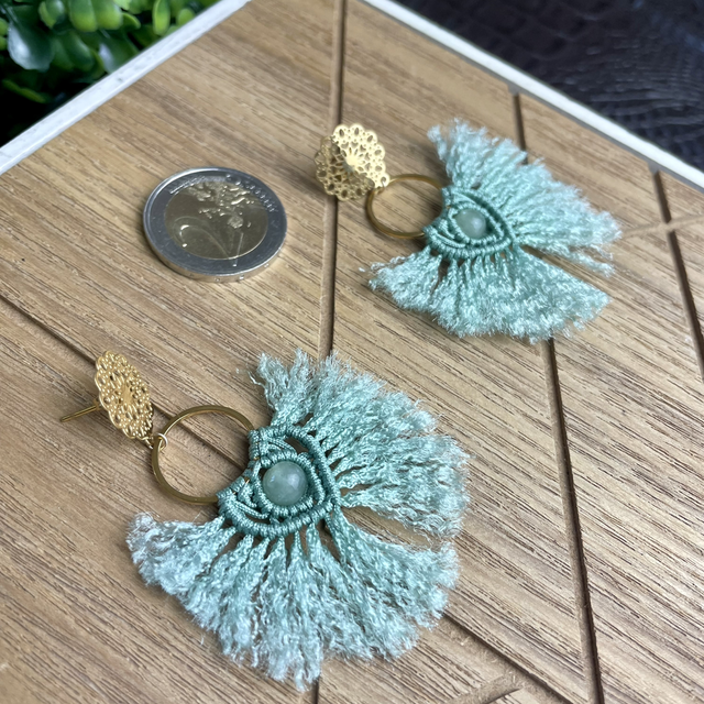 Voici une paire de boucle d'oreille à frange en vert pastel, parfait pour commencer le printemps !