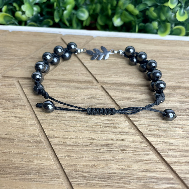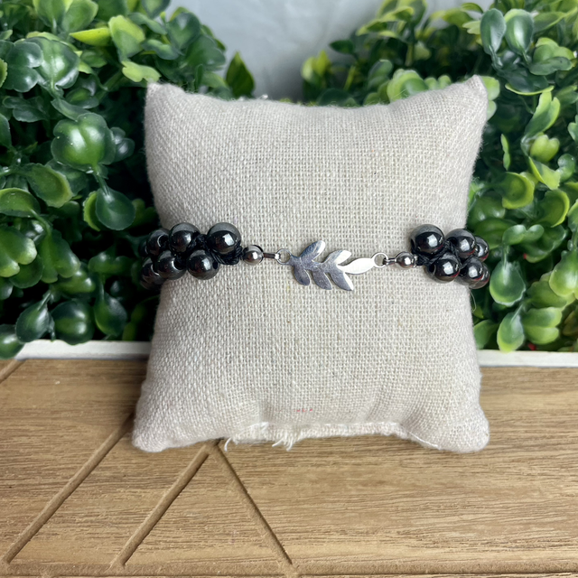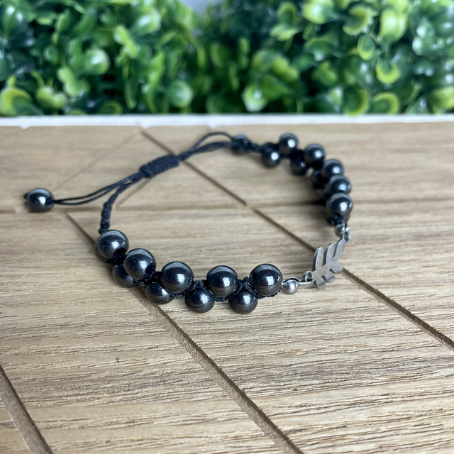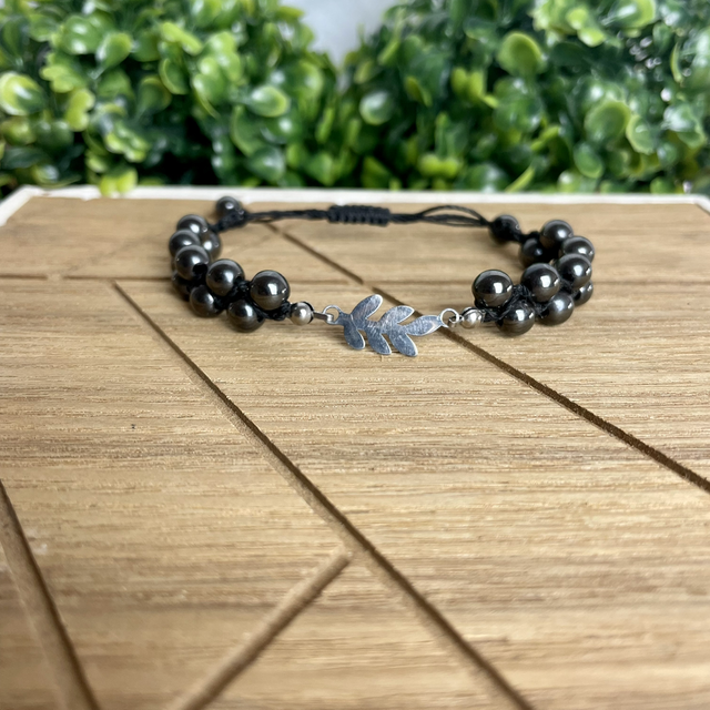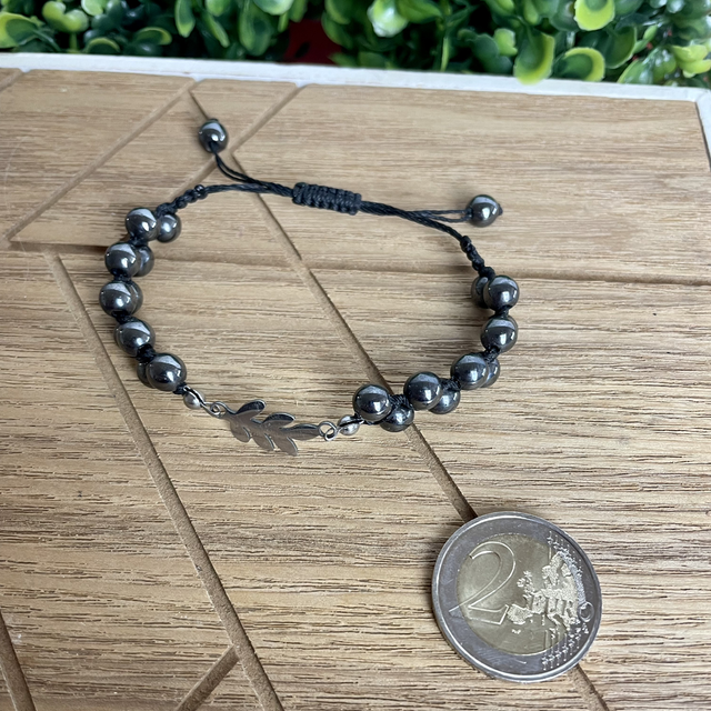 La feuille, représentée sur le connecteur, est un symbole du cycle infini de la vie ( la naissance, la croissance et la mort ), associé à l'hématite, elle accentue la couleur métallisée de la pierre et lui donne davantage de valeur spirituelle.