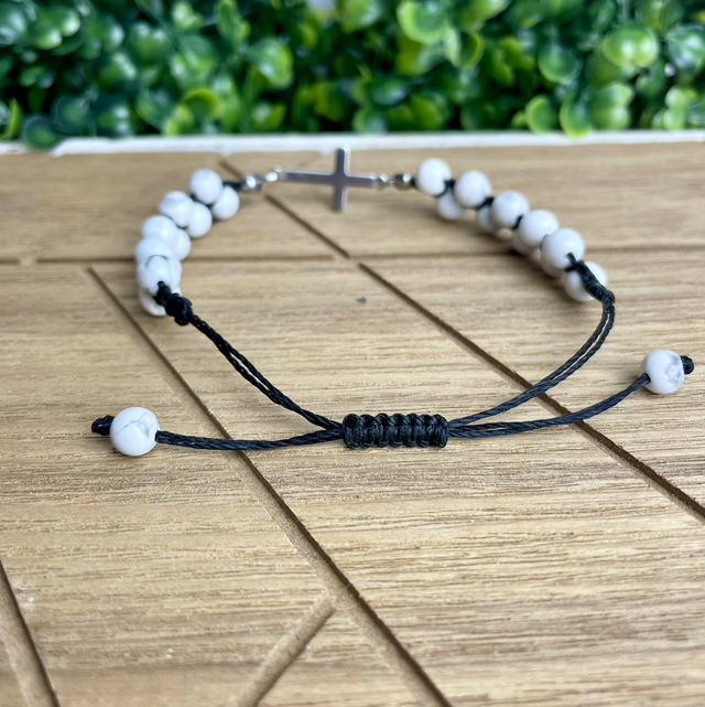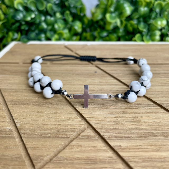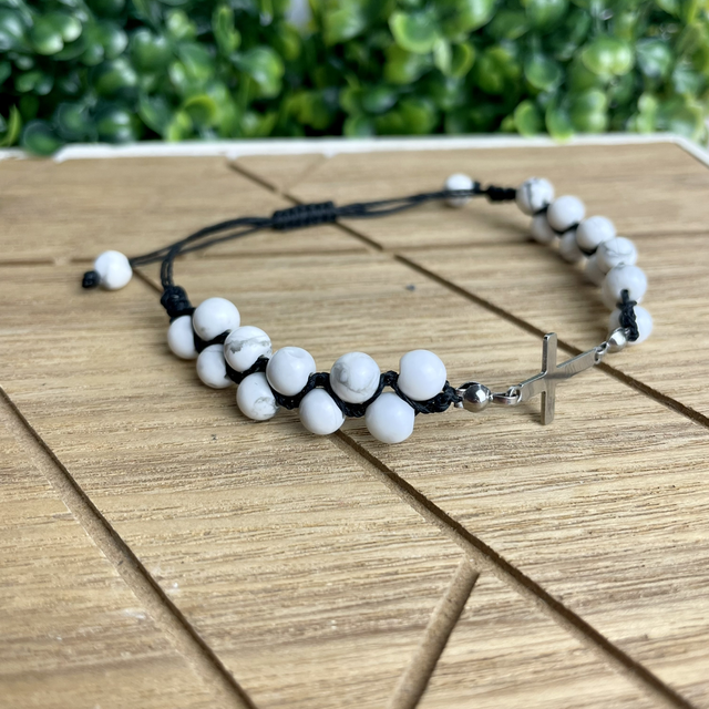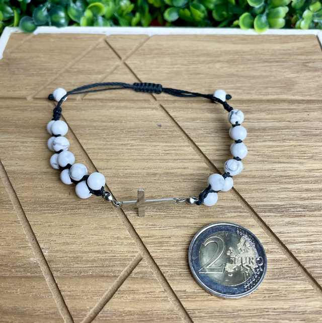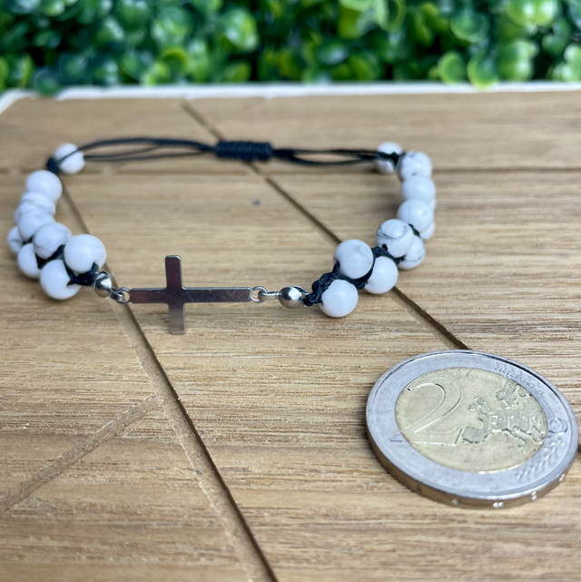 La croix en symbole, sur le connecteur, associée à l'Howlite blanche fortifie le porteur dans sa prise de décision et dans la pureté de ses valeurs spirituelles.