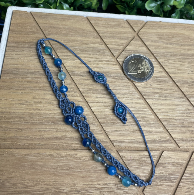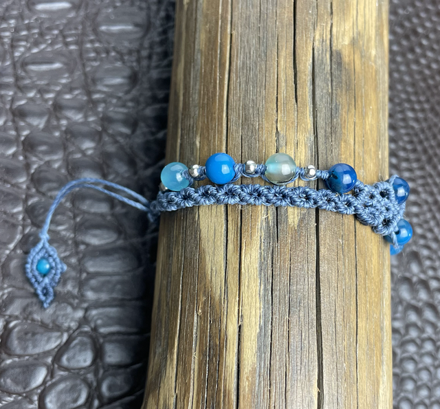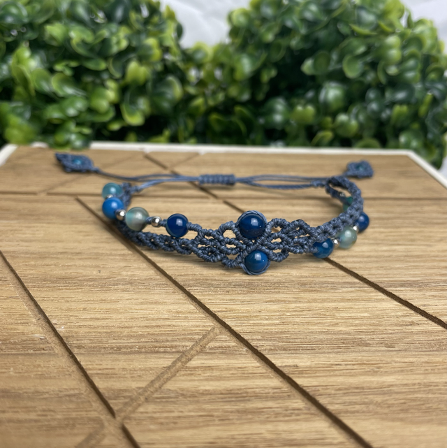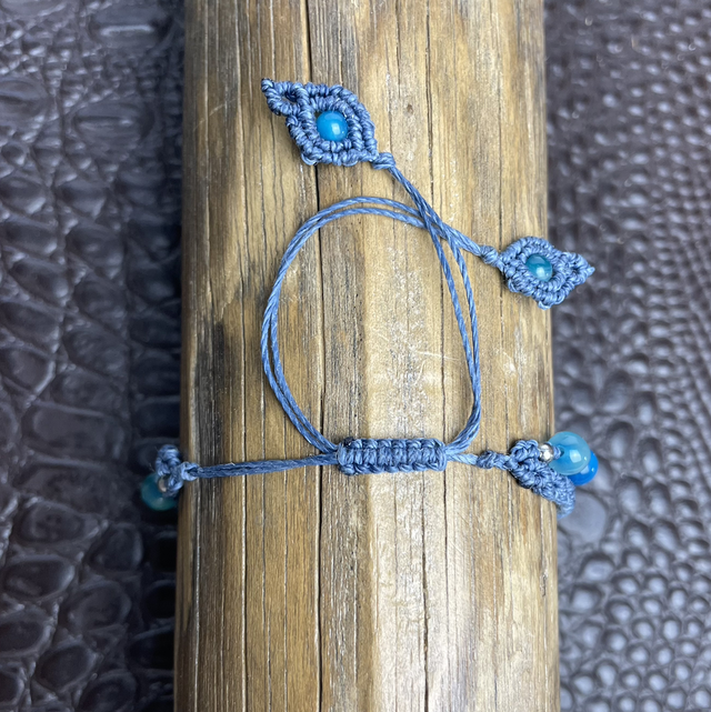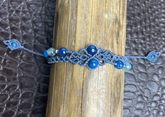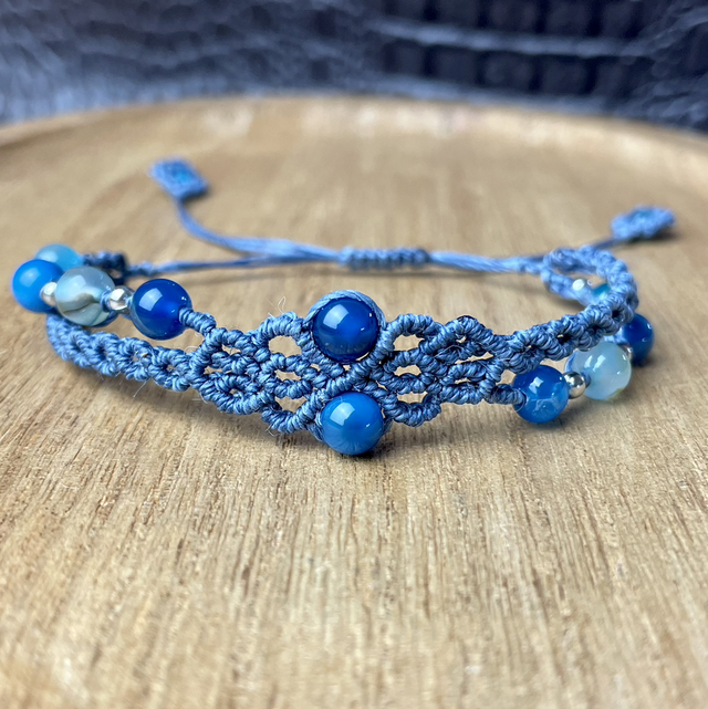 Voici un bracelet unique qui vous protègera tout au long de votre journée ! La création en macramé vous permet d’assurer une solidité au fil du temps. Le fil utilisé est un cordon ciré Linhasita, les perles sont en acier inoxydable et la pierre utilisée est de l’agate bleu. L’agate bleu possède de nombreuses vertus : - Pierre apaisante et calmante - Permet de faciliter la communication - Permet de favoriser la confiance en soi - Atténue le stress et l’anxiété