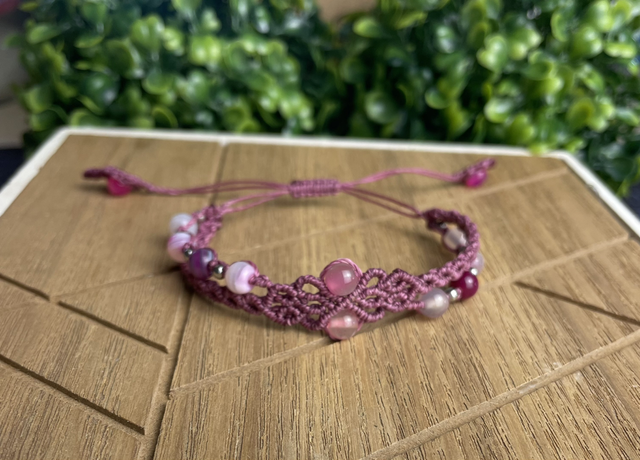 Voici un bracelet unique qui vous protègera tout au long de votre journée ! La création en macramé vous permet d’assurer une solidité au fil du temps. Le fil utilisé est un cordon ciré Linhasita, les perles sont en acier inoxydable et la pierre utilisée est de l’agate rose. L’agate rose possède de nombreuses vertus : - Pierre apaisante et calmante - Permet de faciliter la communication - Permet de favoriser la confiance en soi - Atténue le stress et l’anxiété