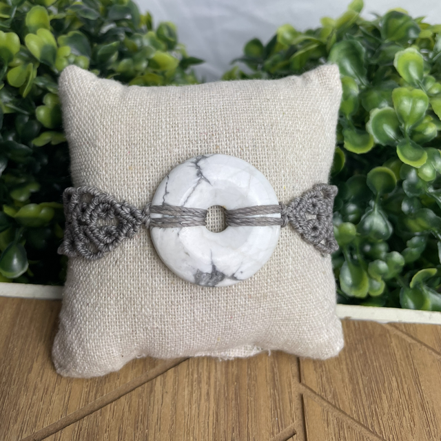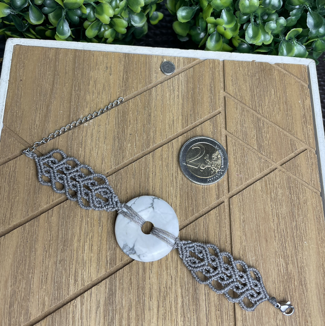 Entouré de fil linhasita ciré, cette pierre en forme de donut's prend tous son charme avec l'art du micro-macramé !