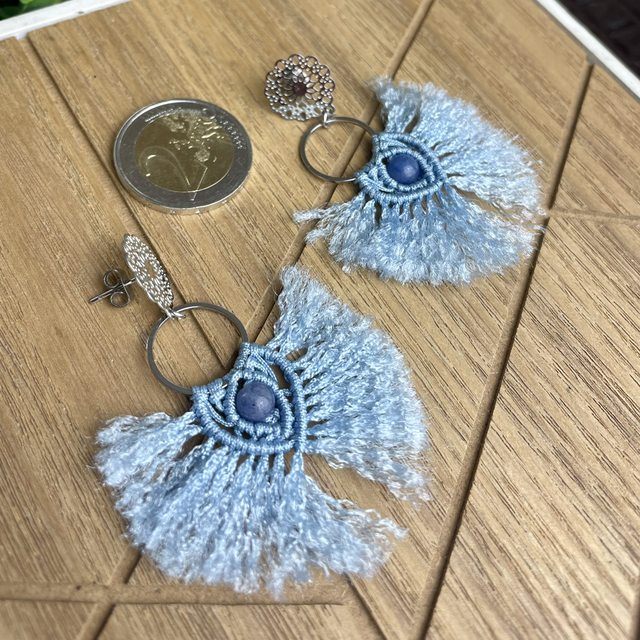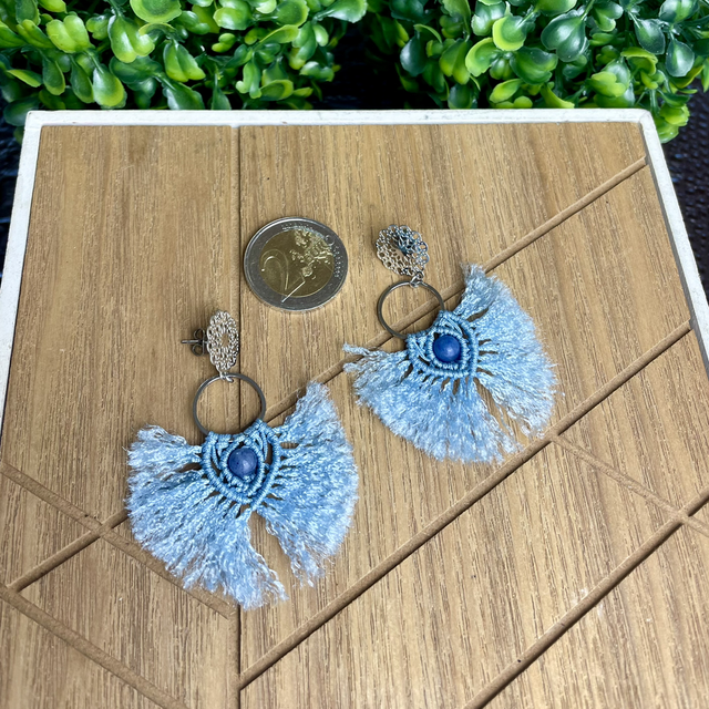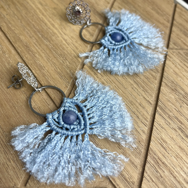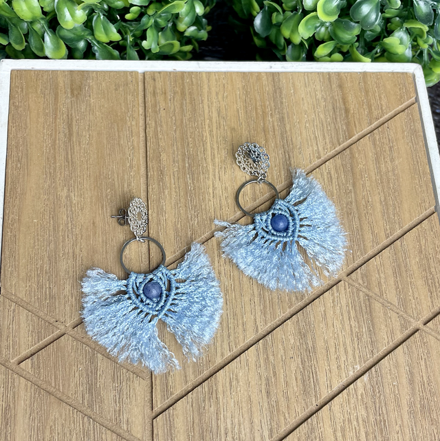 Voici une paire de boucle d'oreille à frange en bleu pastel, parfait pour commencer le printemps !