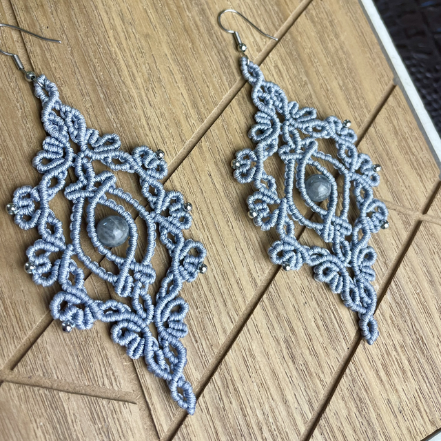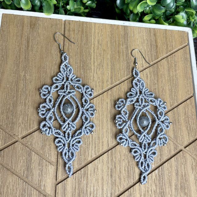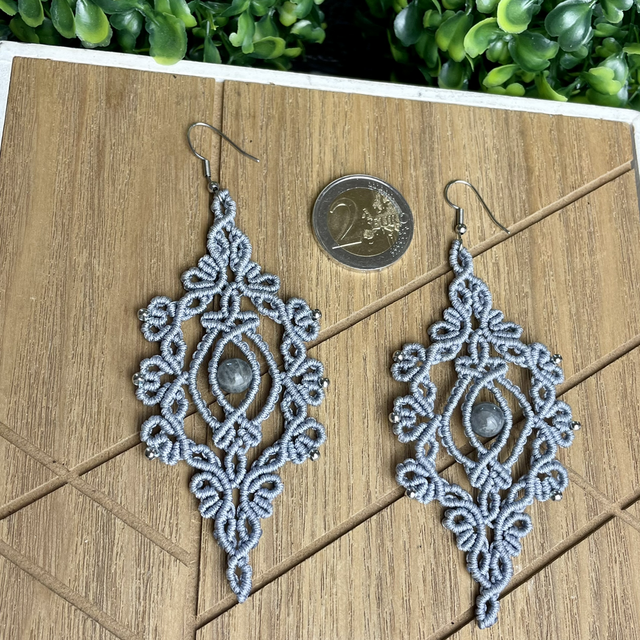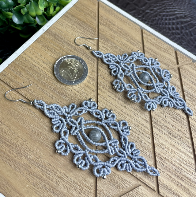 Voici une paire de boucles d'oreilles en macramé couleur grise, avec sa pierre de Labradorite au centre. Créer avec du fil Linhasita en 0,75mm ciré, elles seront robuste dans le temps et très légère, vous ne les sentirez pas sur vos oreilles.