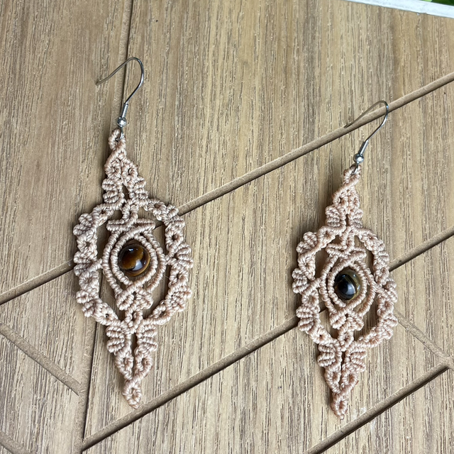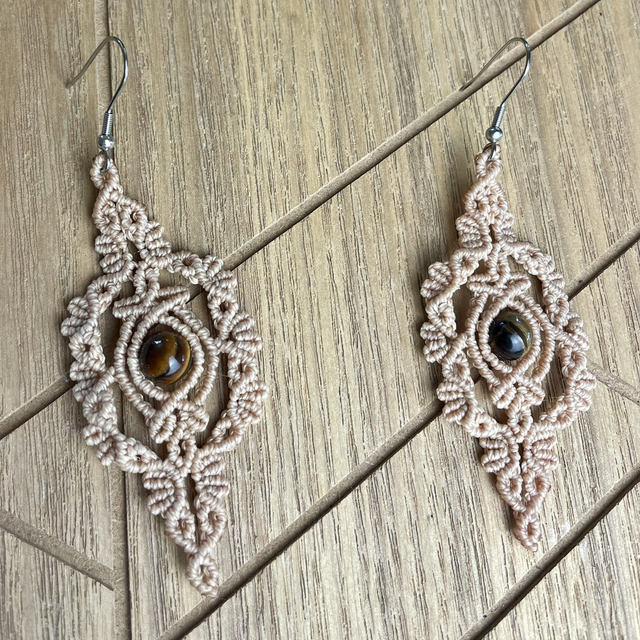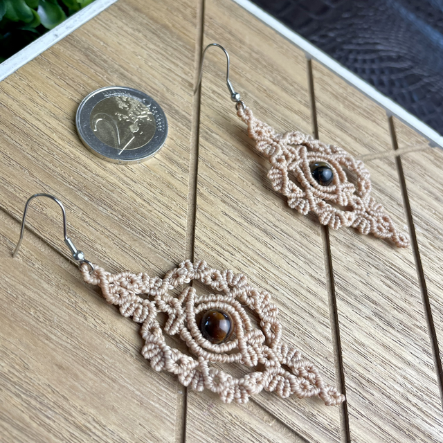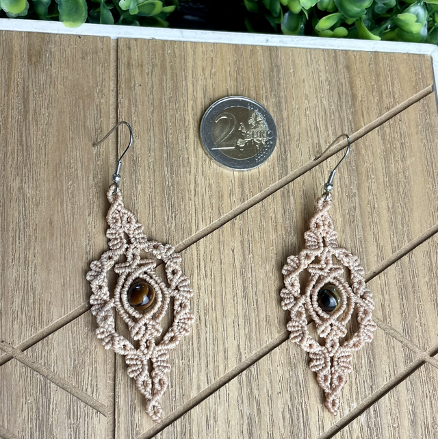Voici une paire de boucles d'oreilles en macramé couleur sable, avec sa pierre d'Œil de tigre au centre. Créer avec du fil Linhasita en 0,75mm ciré, elles seront robuste dans le temps et très légère, vous ne les sentirez pas sur vos oreilles.